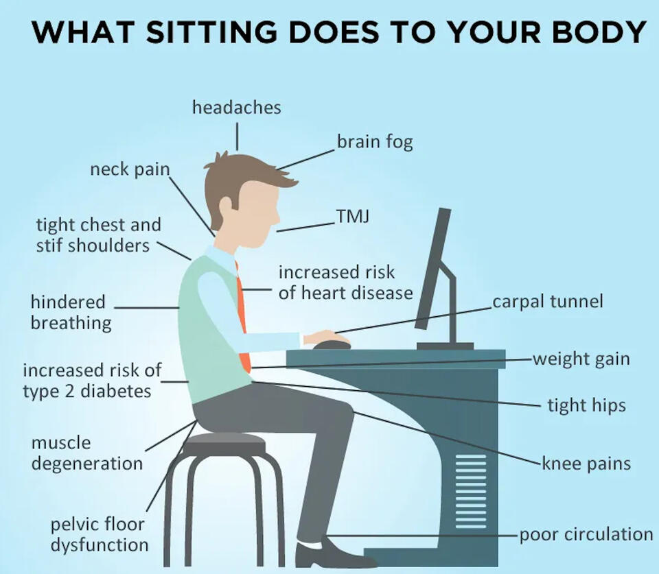 Sitting has become an ingrained part of our modern society. From office and desk jobs to remote work, commuting by car, train, bus, or airplane, playing an instrument, and all levels of schooling—from elementary education to advanced degrees—sitting is unavoidable. Ironically, even in Doctor of Physical Therapy school, we often spend hours sitting through lectures on the negative effects of prolonged sitting. While some might argue for the opposite extreme—standing all day —that doesn’t seem to crack the code either. The key lies in understanding that our bodies are designed to move. Any static posture, when held for too long, can lead to discomfort. The issue is not sitting itself; it is the duration, frequency, prolonged nature, and lack of movement while sitting that all compound into the problem. Regular movement and changing positions are essential strategies to address this modern challenge.