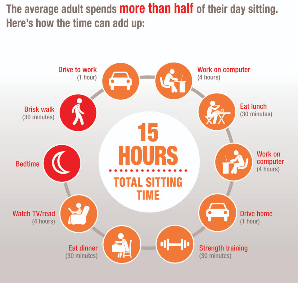 The environment and lifestyle one lives in significantly influence how much time is spent sitting. A study by Daneshmandi et al., 2017 examined approximately 500 Iranian office workers and found they spent an average of 6.29 hours of an 8-hour workday sitting. Notably, 73.6% of participants reported feeling exhausted during the workday. This can be explained using Newton’s first law of motion: an object at rest tends to stay at rest, while an object in motion tends to stay in motion. If you are stuck sitting and are not moving, your body is left feeling unenergized and inclined to remain in that “rest” state.